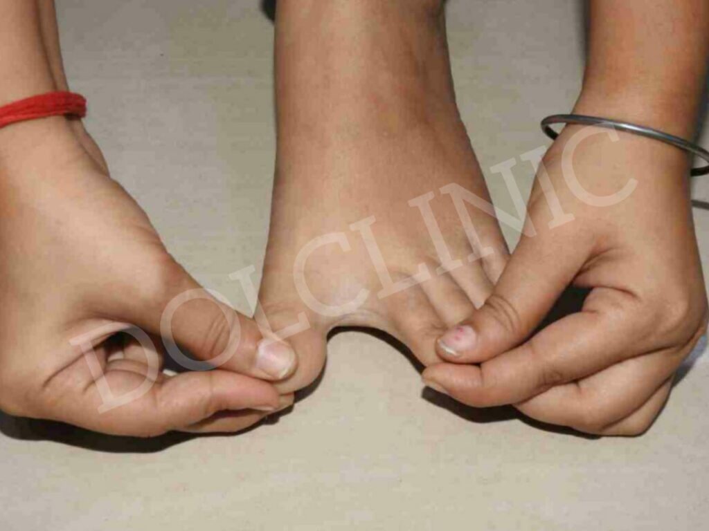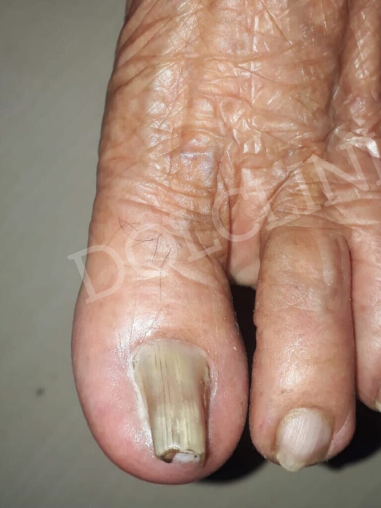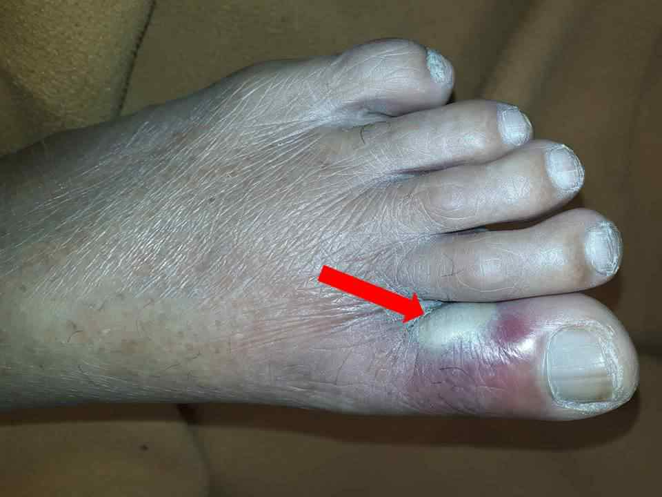 येथे infection चालू झाले आहे . अंगठा थोडासा लालसर आहे.आणि दुखतो आहे . याला Ingrowing Toe Nail म्हणतात . जाडी नखं कापायला खास उपकरणं लागतात .